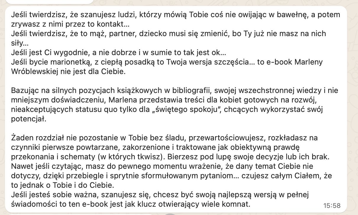 Za tym wszystkim stoi jednak nie tylko strategia, ale lata rozwoju wewnętrznego. Setki godzin kursów, warsztatów, ustawień systemowych, szkoleń z coachingu, afirmacji i manifestacji. To dzięki nim stałam się kobietą, która nie tylko zarabia, ale potrafi uczyć innych, jak łączyć biznes z pracą nad sobą. Jestem self-made milionerką, która wie, że największym kapitałem jest świadomość i odwaga.